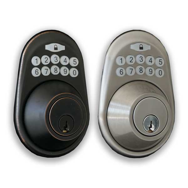 A Stylish PIN operated self contained electronic deadbolt lock with motor driven deadbolt. Available in Satin Nickel or Aged Bronze with a classic oval shape. Fits L or R handed doors